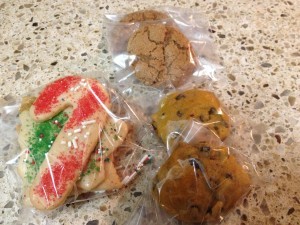 We also baked mini cookies (Gingersnaps, Chocolate Chip Cookies (not pictured), Pumpkin Chocolate Chip Cookies, and Speckulatus Sugar Cookies), and we put them in clear 3X4 or 4X6 plastic bags. Then we placed the cookie bags inside of larger decorative bags and tied them with curling ribbon.