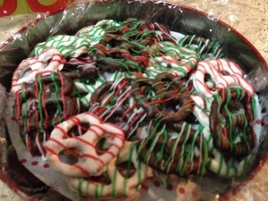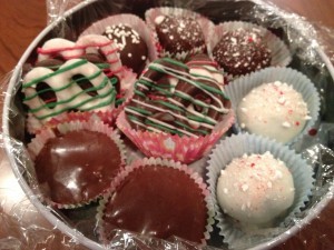Top Layer (Chocolate Truffles, White Peppermint Cake Balls, Chocolate Peppermint Cake Balls, Fudge, and Chocolate Dipped Pretzels):