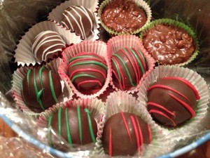Bottom Layer (Chocolate Covered Cherries, Cherry Mash, Ranger Balls, Peanut Butter Balls, and Cookie Dough Truffles):