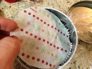 First, I line the tin with a piece of plastic wrap.