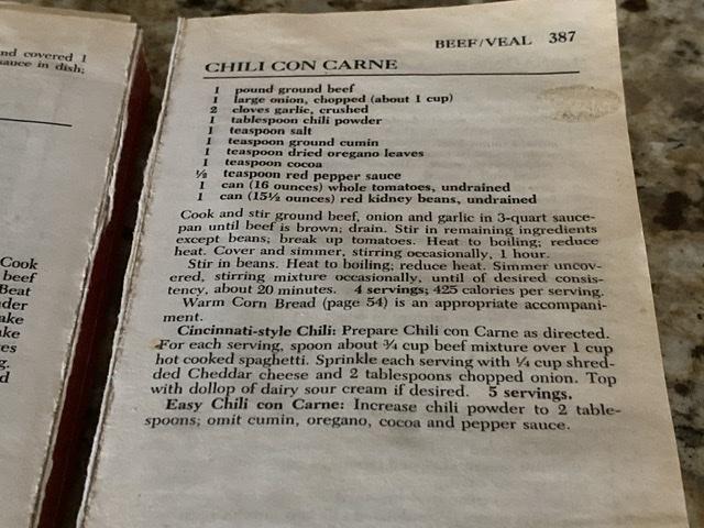 My original recipe came from a little paperback Betty Crocker cookbook that I bought when I was 19 years old, and just recently moved from Missouri to Colorado with the hopes of going to college at UCCS. I think the Chili recipe was one of the few things I made from this cookbook over the past 30 years, and the book pretty much shows that….most of the pages are perfectly intact, but the book recently split in half at the Chili recipe. 😉
