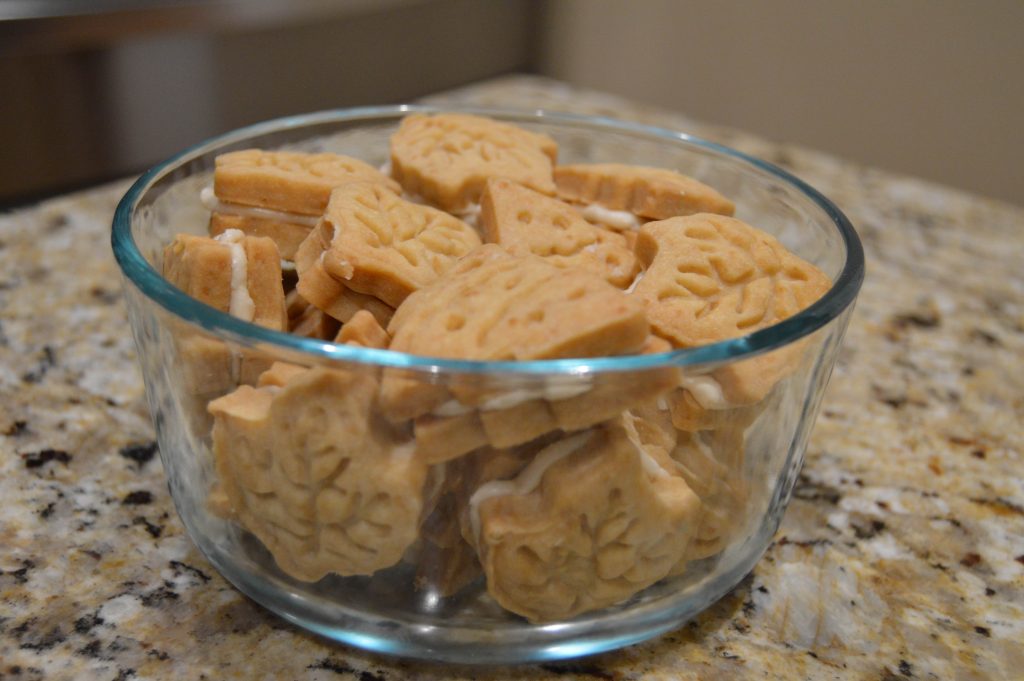 • Spread the bottom of half of the cookies with about 1-2 teaspoon of filling. I found it was easiest to put the filling in a piping bag and pipe the frosting on the cookies- it made the filling look a lot neater.