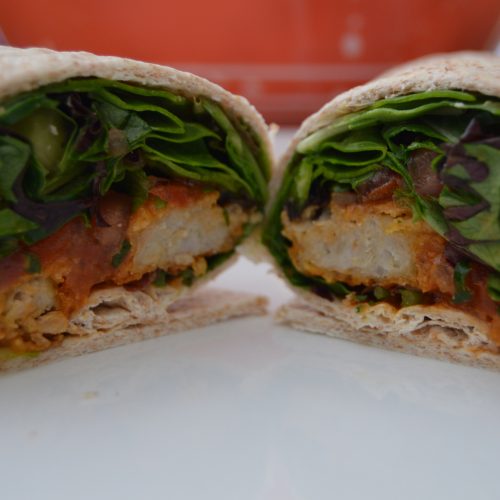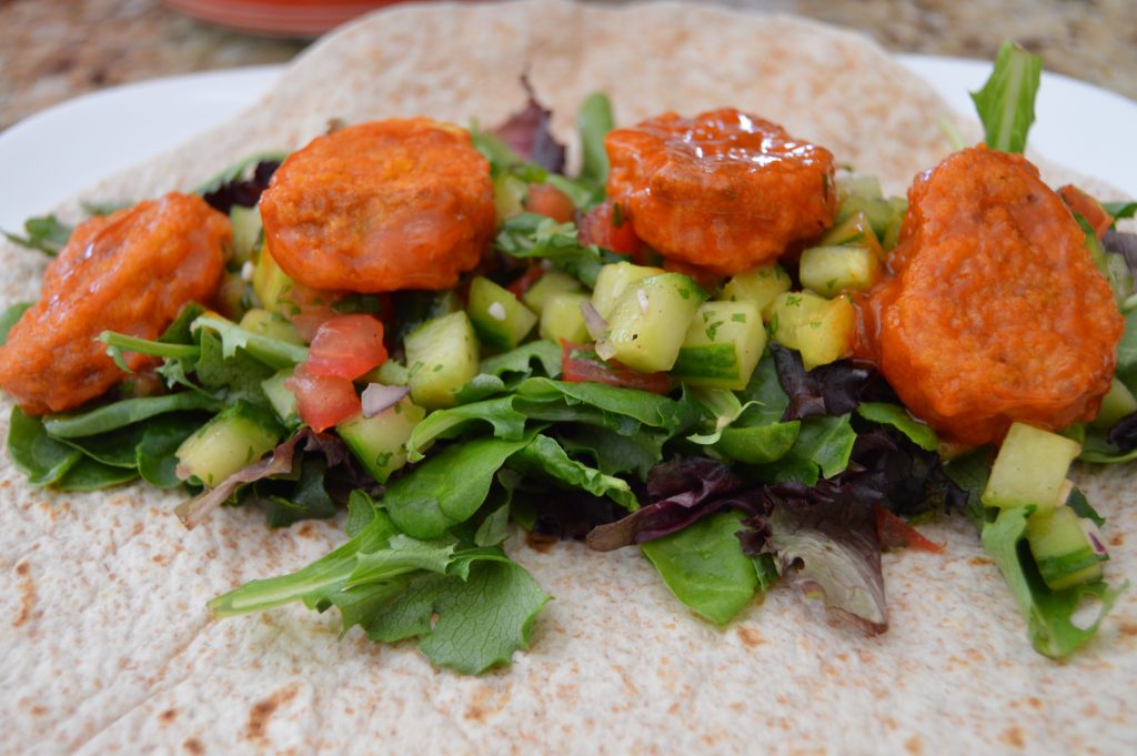 The wrap is made with vegan nuggets dipped in hot wing sauce and wrapped in a tortilla with mixed greens, avocado slices, and a cucumber salsa. Unfortunately, the Café is just too far away for us to go to often. However, I figured that my favorite wrap would be very easy to recreate at home, and I could probably make it even healthier (with organic ingredients, etc.).