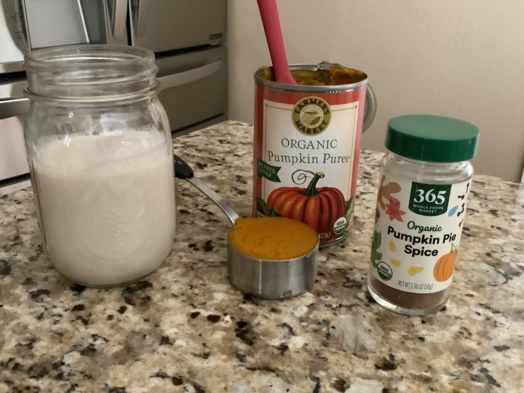 - Add the almond milk, canned pumpkin puree, pumpkin pie spice, and xanthan gum powder to a jar w/ a lid (e.g. pint size mason jar).